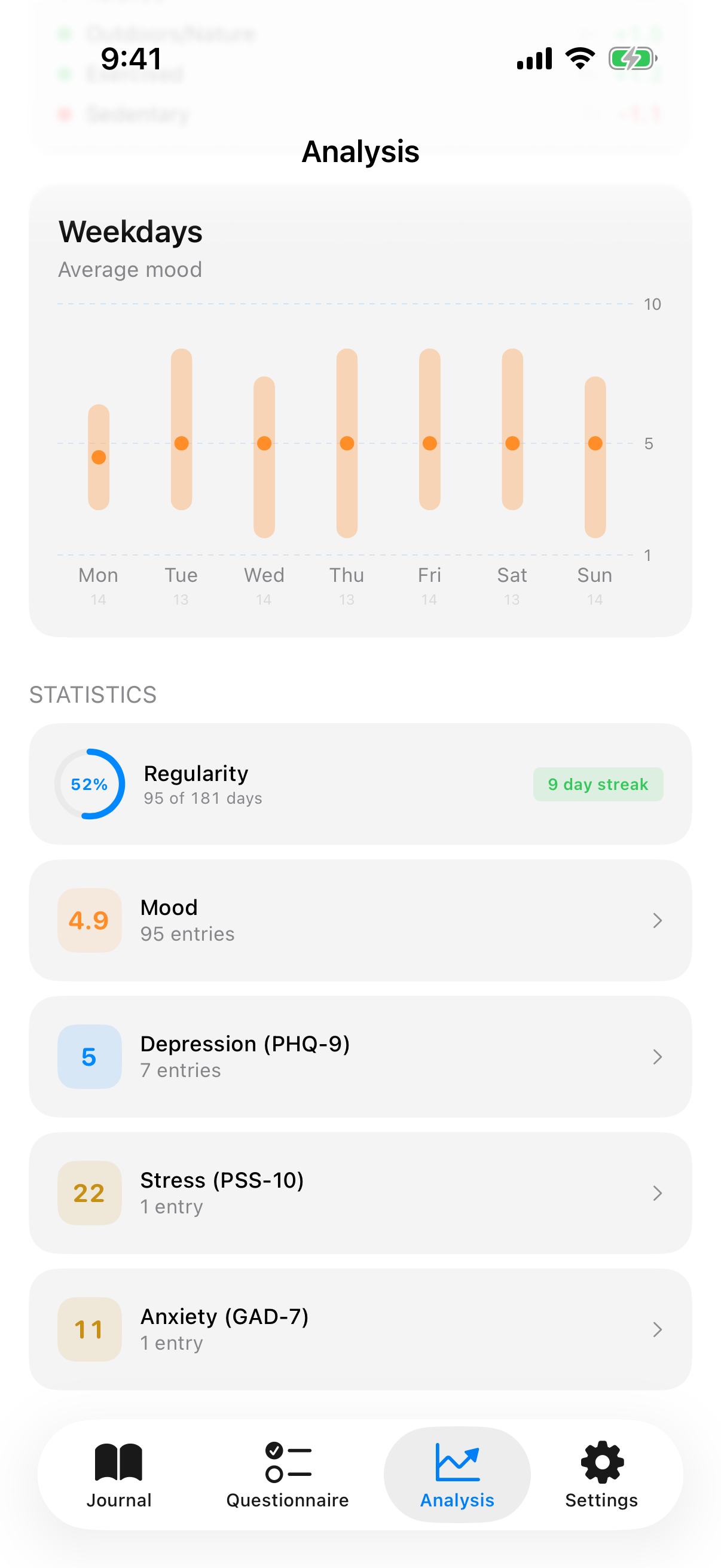 Base factors (60% or more of your entries): These are your habits. The app shows their frequency and mood stability.