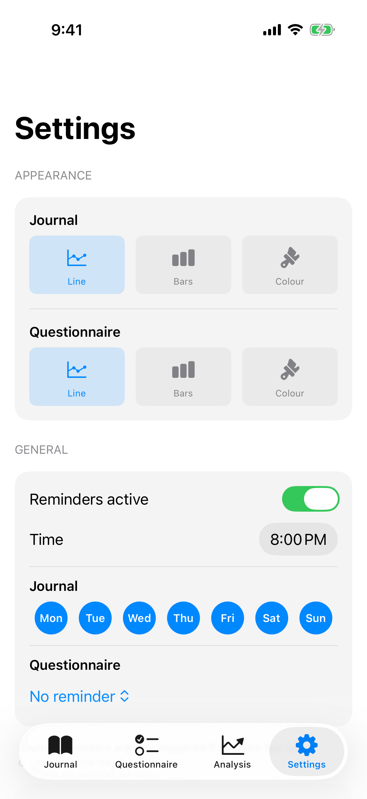Choose one of three chart styles for both journal and questionnaire charts: Line, Bars, or Color.