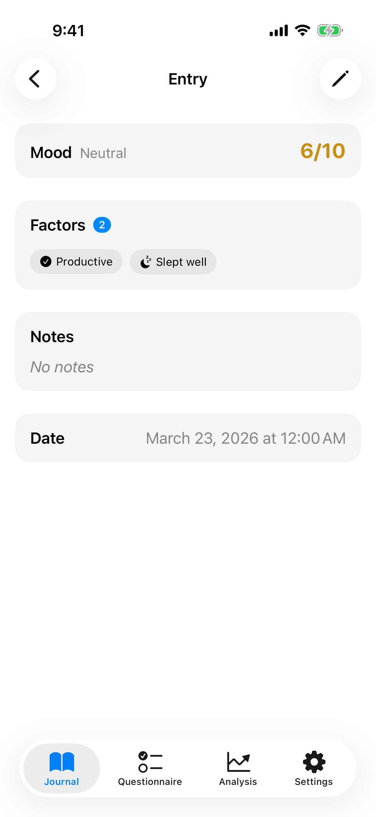 Tap an entry to see the details. Each entry shows your mood score (e.g., 6/10, "Neutral"), the selected factors (e.g., "Productive" and "Slept well"), your optional notes, and the date. The pencil icon lets you edit any entry after the fact.