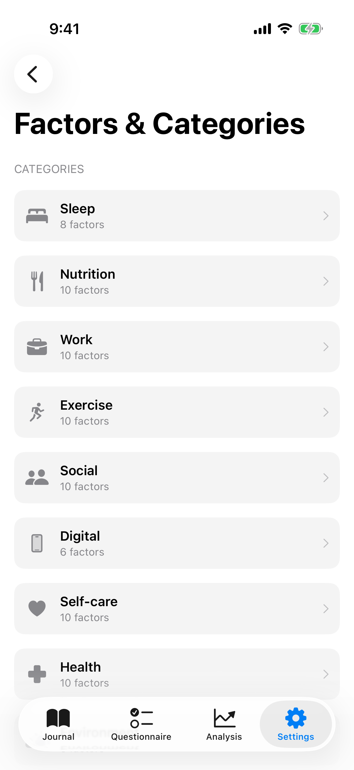 InnerPulse comes with 82 pre-defined influence factors across 10 categories:
